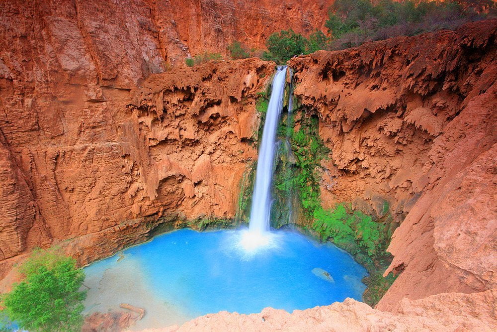 The stunning turquoise blue water at Havasu Falls is a result of dissolved calcium carbonate and magnesium that naturally occurs in Havasu Creek.